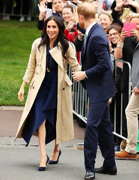 Tra l’annuncio della gravidanza e il tour in Oceania l’attenzione di tutti si è fissata su di lei, e lei non ha deluso mostrando il suo bel sorriso, la sua notevole empatia, la grande affinità con il marito e una serie di mise che mettevano in mostra il pancino. Molti abiti nelle predilette tonalità scure, soprattutto l’amato blu, alcuni dei quali già visti; il migliore secondo me quello di Roskanda con banda azzurra all’orlo, grafico e romantico allo stesso tempo. Chic. Qualcun altro mi è piaciuto meno, come quella specie di wrap dress firmato di Dion Lee indossato a Melbourne, soprattutto quando, portato con il classico trench Martin Grant, il pannello svolazzante dell’abito con conseguente spacco ballerino rendeva l’insieme troppo arruffato. In questo caso, shock.