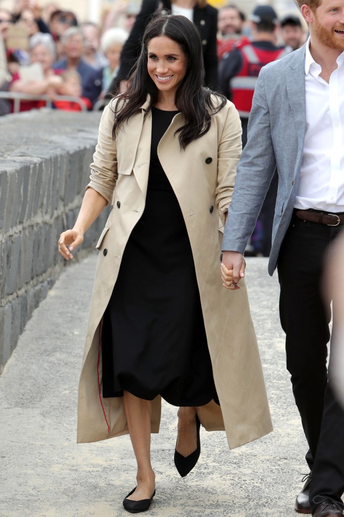 Très chic invece il trench abbinato a un semplice abito nero di Club Monaco nonostante le ballerine (la fanciulla è pur sempre incinta, quindi può) e soprattutto al tubino bianco Karen Gee indossato per incontrare il Governor-General d’Australia e sua moglie, Sir Peter e Lady Cosgrove.