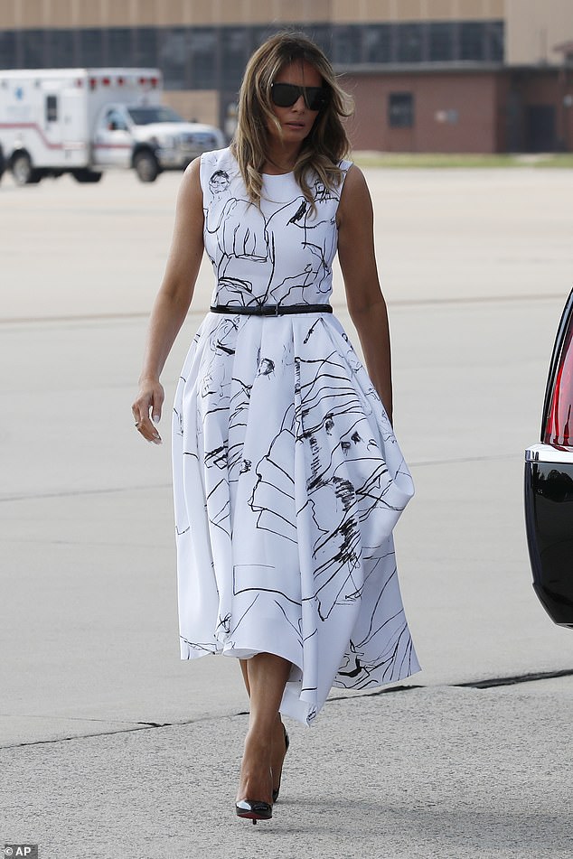 Melania per l’occasione ha scelto un Alexander McQueen della collezione Spring Summer 2020 (costo $2450) che ha scatenato i commenti sul web: te l’ha scarabocchiato Donald sull’Air Fore One? Ora, fermo restando che Lady Violet istintivamente evita di immaginare qualunque privata attività tra POTUS e FLOTUS, possiamo rivelarvi che gli “scarabocchi” sono stati creati dagli studenti della prestigiosa Central St Martins durante una sessione di disegno live, e poi riprodotti sul tessuto.