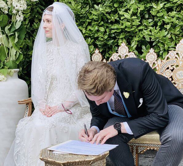 La principessa ha indossato un abito assai castigato, girocollo e con maniche lunghe – in effetti arpionate al dito medio, decisamente non il mio modello preferito – in uno stile che ricorda un caftano, abbondantemente ricamato. Il capo coperto da un velo, sulla fronte un diadema con al centro una broche con un enorme zaffiro, di proprietà della madre; così in un colpo solo c’era sia qualcosa di blu, sia qualcosa di prestato. La Regina Vedova Noor portava invece qualcosa di vecchio: un caftano verde menta indossato in Marocco nel 2014.