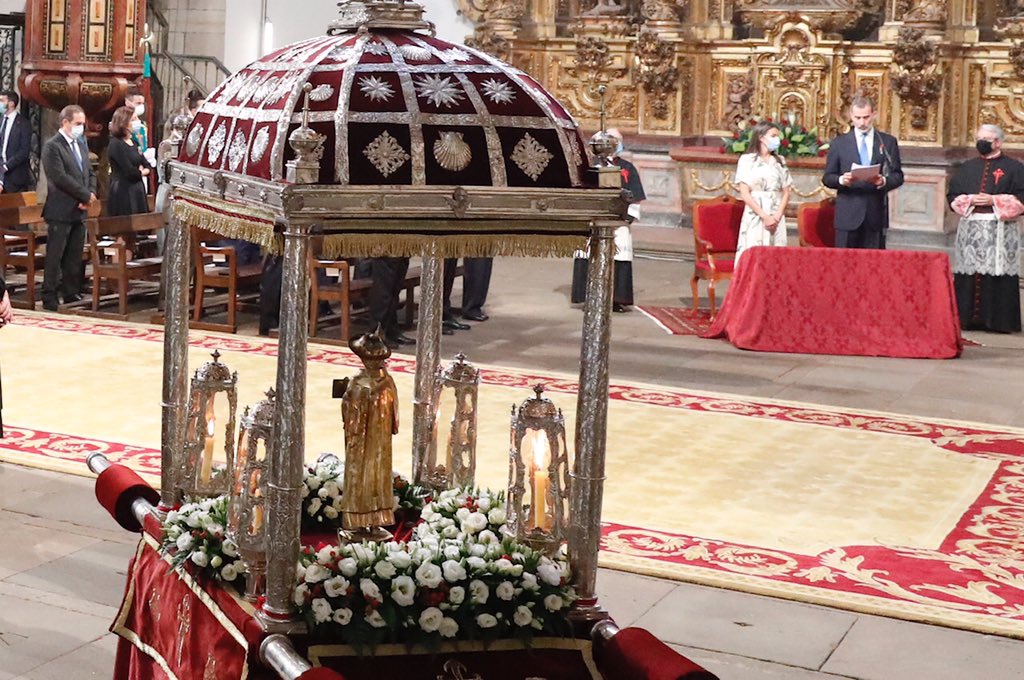 Per celebrare uno dei patroni di Spagna oggi anche Los Reyes hanno raggiunto il santuario; visita inusuale, dato che i sovrani sono solitamente presenti solo nell’anno santo giacobeo (cioè quello in cui il 25 luglio cade di domenica). Ripetendo il gesto del 2014 Felipe VI accompagnato da Letizia, ha presentato al Santo la ofrenda nacional; entrambe occasioni straordinarie: se allora El Rey era appena asceso al trono, oggi la ragione è la pandemia da covid-19, e il tour che i sovrani stanno compiendo in tutte le regioni del Paese per manifestare apprezzamento e vicinanza ai cittadini. Naturalmente celebrazioni ridotte al minimo, massima sobrietà e mascherine d’ordinanza; ma l’anno prossimo ci rifaremo: il 2021 sarà il primo anno santo giacobeo del regno di Felipe.