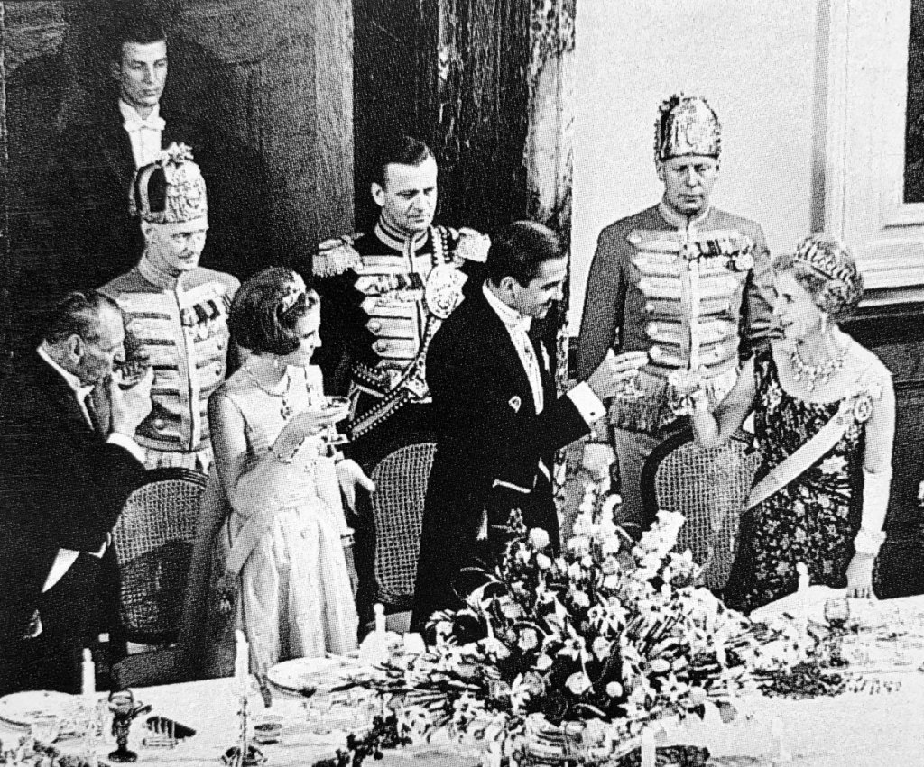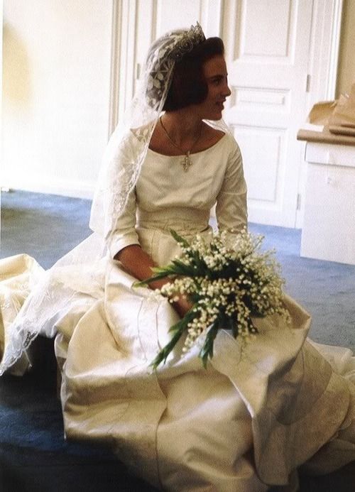Il 10 settembre i sovrani danesi offrono a Copenaghen un farewell dinner in onore degli sposi, poi si parte per la Grecia. Il 18 settembre Atene è affollata di teste coronate come un vivente almanacco del Gotha; in fondo non capita spesso che si sposi un sovrano regnante. La sposa arriva all’altare al braccio del padre; indossa un abito del couturier di fiducia di sua madre, il danese Jørgen Bender. Un modello classico in satin bianco, dalla linea pulita tipica degli anni ’60: scollatura a barchetta, maniche 3/4, cintura alta e il dettaglio della gonna sovrapposta che resta appena aperta, da cui parte il lungo strascico. In mano porta un bouquet di mughetti allegramente disordinato.