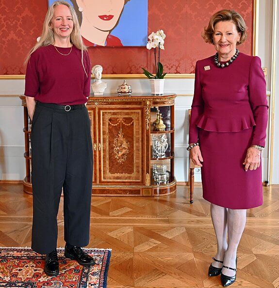 Sono giorni complicati per la regina di Norvegia: le voci che da tempo si susseguono sulle condizioni di salute di Re Harald sembravano aver trovato conferma la scorsa settimana, quando l’apertura del Parlamento per la prima volta in trent’anni si è tenuta alla presenza dell’erede Haakon e non dal sovrano, assente per problemi respiratori cui due giorni fa è seguito un intervento per la sostituzione di una valvola cardiaca. Sonja, col garbo la grazia e la dignità che le sono propri tiene fede alla su agenda, e mercoledì ha ricevuto a Palazzo Reale Ciana Phillips, vincitrice del Queen Sonja Print Award. Semplice ed elegante in un abito con baschina in sbieco, di un bel viola melanzana che le dona molto. E non vi stupiscano le calze di quel colore, negli anni ’80 erano il tratto distintivo di molte aristocratiche. Chic.