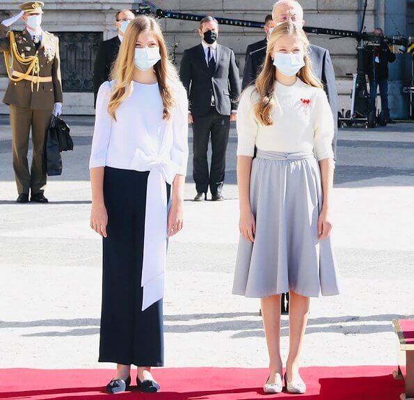 Gonnellone color polvere e uno spumoso pulloverino bianco con maniche al gomito (& Other Stories) per la Princesa de Asturias; pantaloni blu (Stradivarius) e blusa bianca fermata da una lunga fusciacca (Zara) per l’Infanta. Scarpette sbrilluccicose con un filo di tacco per Leonor, ballerine di camoscio blu per la più alta Sofía; capelli in un romantico semiraccolto per la futura regina, un più moderno liscio perla sorella. L’una, più rétro, mi ha ricordato nonna Sofía; l’altra, più contemporanea, mamma Letizia.