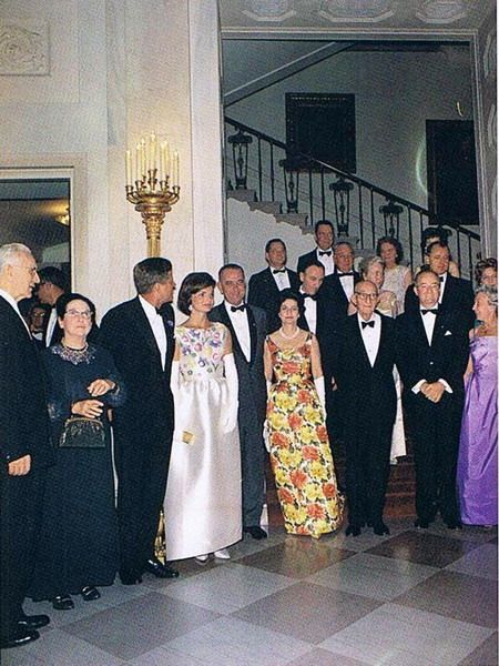 Sublime l’undici marzo 1962 per l’udienza privata in Vaticano, accolta da Papa Giovanni XXIII, in lungo nero con mantiglia.Splendida nei mille cambi durante il viaggio in India e Pakistan, accompagnata dalla sorella Lee Radziwill, dal 12 al 21 dello stesso mese. In nove giorni la First Lady indossa almeno 22 mise diverse; le cronache del tempo riportano una collezione di abiti declinati nei colori dei fiori delle spezie e della pietre preziose del subcontinente indiano: il bianco il giallo l’arancio il verde il rosa pesca.