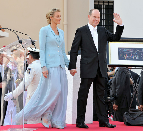 Dodici anni più tardi il Principato è in festa per un matrimonio tutt’altro che riservato: il sovrano, Albert II, sposa la nuotatrice sudafricana Charlene Wittstock. Venerdì 1 luglio 2011 nella Sala del Trono del Palais Princier la cerimonia civile che, come accade nei Paesi cattolici che contrariamente al nostro non hanno un accordo specifico col Vaticano, precede quella religiosa. Anche questa sposa è in azzurro, una tonalità che secondo quanto riferito sarebbe quella dei suoi occhi; per lei la Maison ha disegnato un completo con leggeri pantaloni palazzo orlati di pizzo. Una mise très chic e altrettanto originale, e anche in questo caso avevamo ben sperato; poi l’originalità è mutata in incostante eccentricità, e vedremo cosa ci riserverà il futuro.