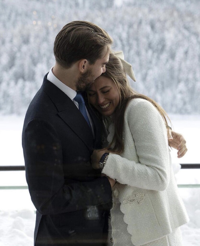Quatro settimane fa, sabato 12 dicembre, il trentaquattrenne Philippos, figlio minore di Costantino e Anne-Marie di Grecia, ha sposato in un’intima cerimonia a Sankt Moritz la fidanzata Nina Flohr. La sposa era nel più classico tailleur Chanel in tessuto bouclé avorio, calze coordinate così come le scarpe slingback, cioè aperte dietro (in montagna?) e fiocco aggrappato ai capelli scompigliati (resto sempre colpita da chi si presenta spettinata al proprio matrimonio, ma non è questo l’argomento del post).
