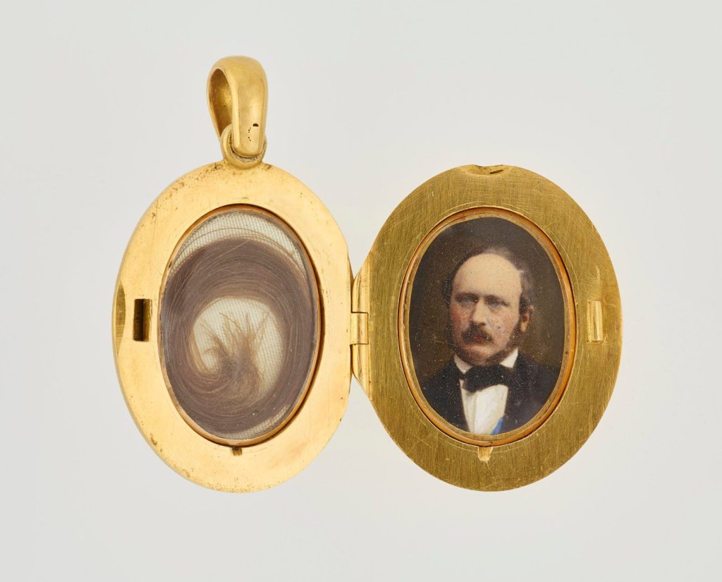 È con lei che si affermala mourning jewellery, i gioielli da lutto; i più classici sono i locket, quei ciondoli che si aprono rivelando da un lato un piccolo ritratto, dall’altro una ciocca di capelli, come in quello appartenuto proprio alla sovrana, con fotografia e capelli del consorte. Il ciondolo in oro è decorato sul fronte da un ovale di onice profilato di bianco, su cui brilla una stella a sei punte di diamanti; sulla cornice corre una frase in tedesco, realizzata in smalto blu, che il catalogo del Royal Collection Trust traduce approssimativamente: l’anima pura si innalza verso il Signore. Sul retro un’incisione, anch’essa in tedesco, che reca i nomi dei coniugi e la data della morte di lui: 14 dicembre 1861.