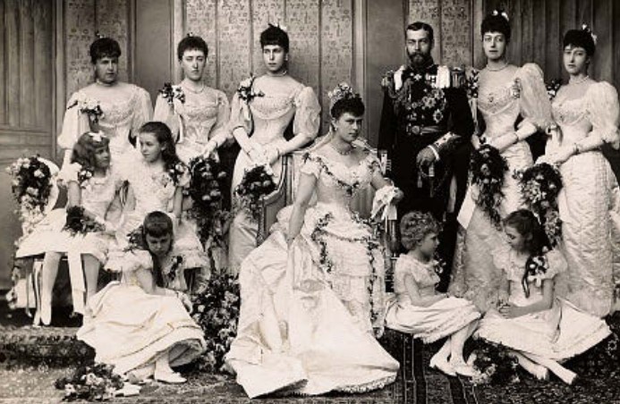 Quel 6 luglio 1893, il giorno in cui sposò George, Mary aveva dieci damigelle; una delle quali era Alice di Battenberg, la madre di Philip (è la prima bambina as inistra, in seconda fila, seduta su una sedia). Ed ecco che il cerchio si chiude.