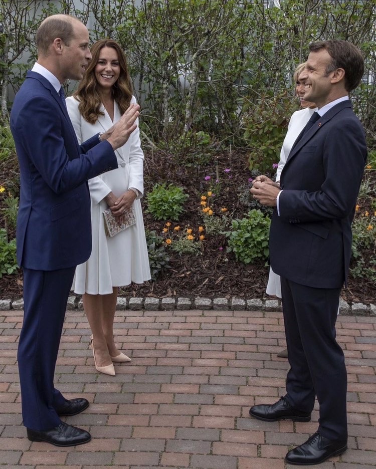 La Duchessa di Cambridge ha scelto il total white – come Brigitte Macron, che si intravvede dietro al marito – un robe-manteau firmato Alexander McQueen, bello ma un po’ eccessivo per la circostanza. Al polso sinistro un bracciale a tre fili di perle appartenuto a Diana; ai piedi delle slingback di un beige cipriato bruttarello assai, e totalmente sbagliato per la sua carnagione. Ma attenzione, perché c’è un dettaglio interessante: intravvedete il fiocchetto sul tallone? Ebbene sì, è il modello Deneuve del brand italiano Aquazzurra. E chi ha reso famoso nel mondo brand e modello? Meghan, Duchessa di Sussex e cognata di Catherine! Via, scatenatevi scatenatevi con le supposizioni. Chic.