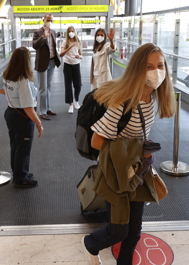 Leonor – maglietta marinara a righe bianche e blu, jeans e Superga bianche – è arrivata all’aeroporto con tutta la famiglia, e questa volta e mascherine hanno avuto le doppia funzione di proteggere El Rey e la sua famiglia dal contagio e celare la commozione dell’arrivederci.