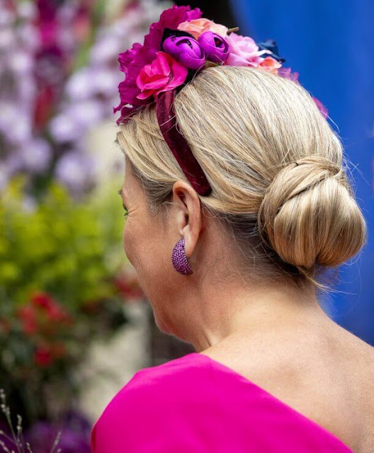 Máxima non ha dubbi: ricicla un vecchio completo Natan – blusa shocking pink su gonna fantasia – e lo completa con un cerchietto floreale come non si vedeva dai tempi dei romani Floralia.