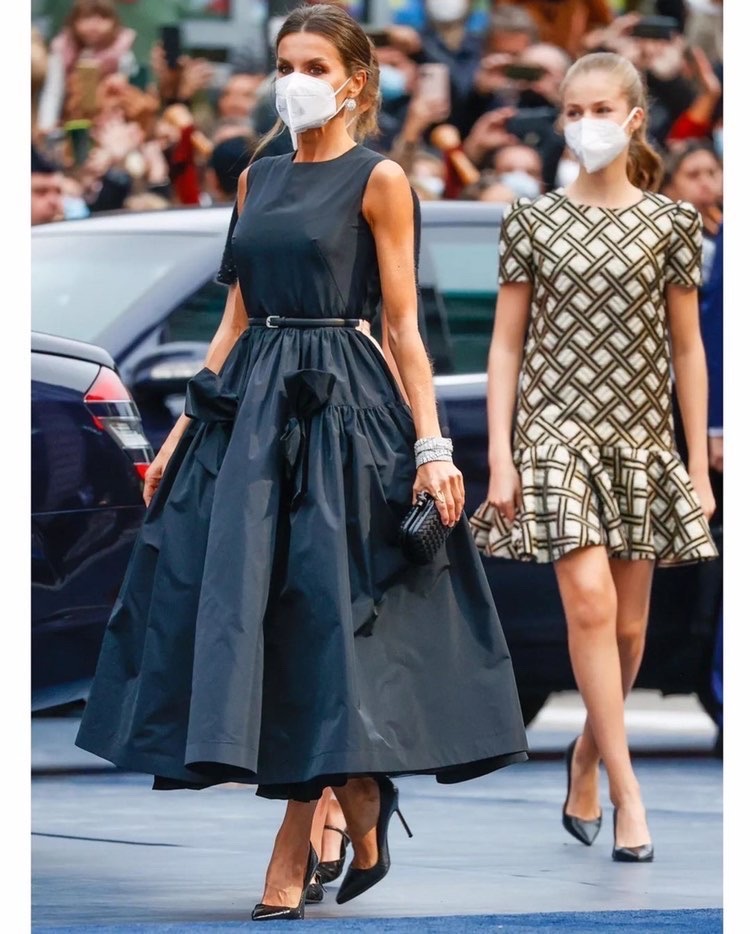 Il venerdì mattina all’hotel Reconquista l’incontro con i vincitori delle varie sezioni del premio; impegno istituzionale che richiede una certa sobrietà, disciplina in cui Letizia è campionessa olimpica. E cosa c’è di più sobrio che riciclare un tubino principe di galles di Hugo Boss? Chic. Per essere sicure, anche Leonor si è buttata sul riciclo, scegliendo l’abitino drappeggiato color carta da zucchero, della maison sivigliana Vogana, già indossato a giugno per l’anniversario dell’ascesa al trono del padre. Stile camicia da notte per la sorella Sofía, non mi fa impazzire ma è interessante vedere le due ragazze che iniziano a diversificate le loro scelte di moda.