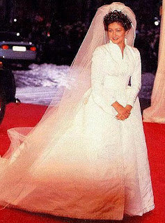 La sposa indossa un abito creato anch’esso da Jørgen Bender, che aveva già vestito da sposa Margrethe, le sorelle Anne Marie di Grecia e Benedikte e una delle figlie di questa, Alexandra von Sayn-Wittgenstein-Berleburg. Un modello in pesante seta pura punteggiata da novemila perle che sottolineano il collo montante, le lunghe maniche e lo strascico di quattro metri che parte dalla ricca gonna; la vita è segnata da un’alta fascia, un tema questo che rimanda non solo all’abito dell’altra royal bride dell’anno, Marie Chantal Miller – che il 1 luglio aveva sposato il diadoco Pavlos, cugino dello sposo – ma anche quello di Grace, paragone inevitabile praticamente di ogni sposa reale da 65 anni a questa parte.
