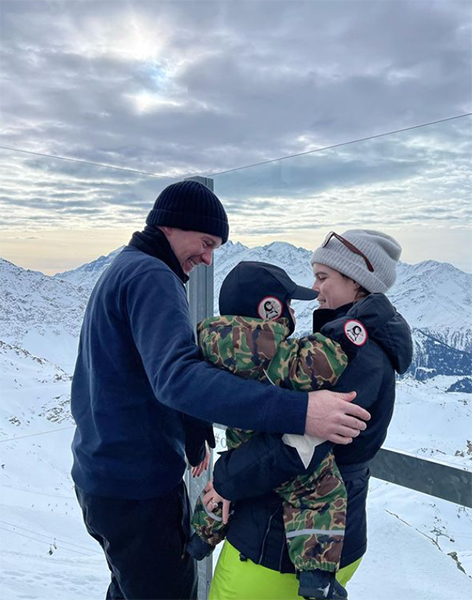 Nel primo il pupo delle nevi si gode l’abbraccio di mamma e papà davanti a un paesaggio alpino; onestamente la cosa che si vede meglio di lui – praticamente l’unica – è lo scicchissimo tutone camouflage, e appena si riesce a scorgere il profilo.