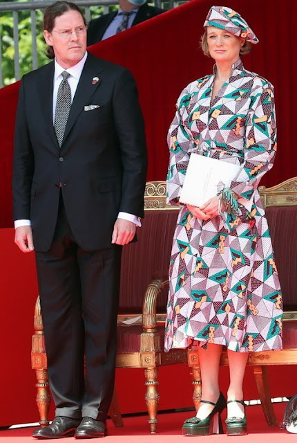 È questa la prima volta che la principessa, accompagnata dal partner Jim O’Hare (francamente non ho capito se siano sposati, e d’altra parte Delphine non è sul sito della Famille Royale), compare in una occasione ufficiale cui partecipa anche il padre. Nel luglio dello scorso anno Delphine aveva già presenziato con i fratelli alla Fête Nationale, dove si era fatta notare un originale (molto, pure troppo) completo composto da abito+coppola+mascherina di Erratum Fashion, brand belga che si ispira alla cultura africana. Sarà stato un metamessaggio di riparazione per gli orrori compiuto dall’antenato Leopoldo II in Congo?