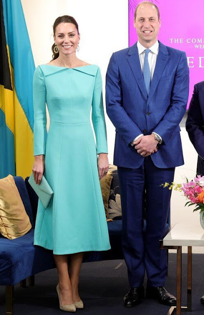 Ormai mi conoscete abbastanza da sapere che l’abito indossato per l’arrivo alle Bahamas è nel colore che sommamente aborro, ma a parte le (ottime) ragioni diplomatiche devo dire che questa creazione di Emilia Wickstead ha una bella linea, longuette con brio, e la gonna a trapezio esalta la figura di Catherine. Peccato lo scollo, con quella specie di origami. Leziosissima la pochette in tinta, diligente – cioè corretta ma banale – la scelta degli orecchini con pietre color turchese. Resta un dubbio: ma alle Bahamas fa molto più freddo che in Giamaica? Boh.