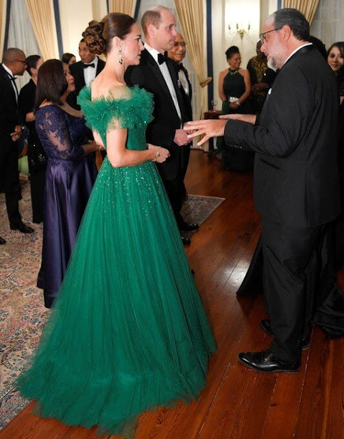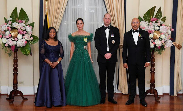 Le occasioni improntate a una particolare formalità sono state fondamentalmente due, una cena di gala e una parata militare, entrambe in Giamaica. Il gala dinner offerto dal Governatore Sir Patrick Allen era black tie (cravatta nera, cioè in smoking), un dress code leggermente meno formale del white tie (cravatta bianca, cioè in frac); non si portano diademi né le fasce degli ordini, ma la società britannica, al contrario della nostra, concede alcune insegne. Infatti i signori indossano le loro medaglie: quelle del Governatore un po’ assembrate sul rever della giacca; meglio William, che probabilmente è anche più pratico di questo genere di cose. Il duca porta anche la stella dell’Order of the garter e così sua moglie; nel suo caso però la stella è quella del Royal Victorian Order, di cui è Dama di Gran Croce. Catherine indossa anche il Royal Family Order di Elizabeth II, contrassegnato dal nastro giallo. L’abito è di Jenny Packman, il Wonder Glitter Tulle Gown, e a Lady Violet non piace per niente. No al tulle in quel colore, no alle paillettes sul tulle e no al tulle piazzato così sulla scollatura (è sicuramente tulle in seta, ma la sensazione di prurito arriva fin qui).