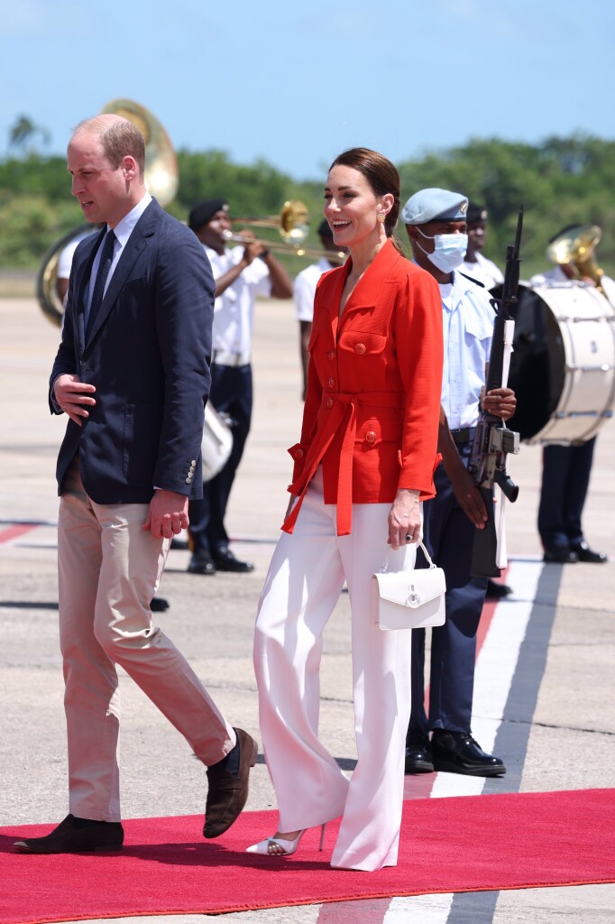 Stesso criterio per le mise indossate alla partenza, scelte sulla base dei colori non usati in occasione dell’arrivo. E così, se la bandiera del Belize è composta da un’ampia fascia blu intenso compresa da due più piccole in rosso e al centro un disco bianco con lo stemma nazionale, ecco che Catherine sceglie il bianco e rosso per quella che è la mise che preferisco in assoluto: una favolosa sahariana rossa vintage (YSL, chi altri?) sul tutto bianco: pantaloni ampi (Alexander McQueen), borsetta Mulberry riciclata e le scarpe Aquazzura di cui sopra. Molto molto chic.
