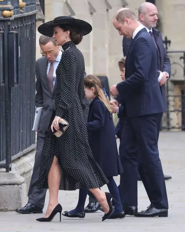 Finalmente eccoci alla Duchessa di Cambridge. Appena l’ho vista due cose mi hanno colpita: perché un abito così leggero, e perché in nero – ancorché punteggiato di pois – se evidentemente il dress code lo aveva escluso. Domande entrambe senza risposta: la seconda rientra nel più ampio campo della mise sbagliata, la prima sfiora uno dei grandi misteri delle royal ladies di ultima (e penultima) generazione, che spesso appaiono – soprattutto di sera, va detto – con abiti impalpabili senza protezione e francamente senza ragione. In questo caso invece il mistero è solo uno: perché? L’abito è firmato Alessandra Rich, che aveva fornito a Catherine un altro abito a pois, di ben altra linea, secondo me (Dress like a Princess – Purple edition). È in leggerissimo crêpe de chine, è pure Made in Italy, ma ahimè non è un abito adatto alla prima parte della giornata per modello e lunghezza della gonna, dotata pure di spacco, anche se casto. E non fatevi trarre in inganno dal colletto con abbottonatura laterale, che evoca la kosovorotka, la tipica blusa indossata dagli uomini russi.
