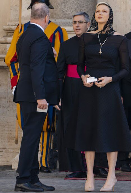 . La Princesse ha coraggiosamente affrontato la canicola romana scelto di indossare: il nero e non il bianco, colore indossato per incontrare Papa Benedetto XVI nel 2013 lo stesso Francesco nel 2016. Allora Charlène aveva usufruito del privilège du blanc, il privilegio a vestire di bianco, riconosciuto alle consorti di sovrani cattolici – ai nostri giorni Spagna Belgio e Lussemburgo – cui in effetti né la principessa consorte di Monaco né quella del Liechtenstein avrebbero diritto, graziosamente concesso anche a Charlène in occasione della prima visita.