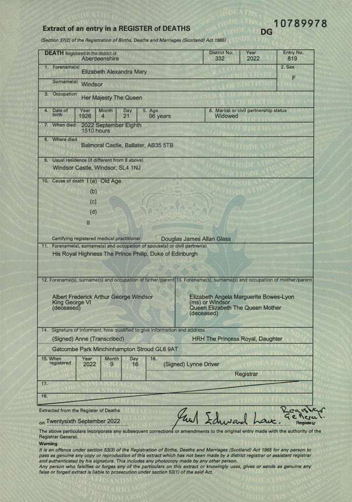 La seconda notizia viene dal Regno Unito: sono stati resi noti ora e causa della morte di Sua Maestà, deceduta giovedì 8 settembre alle ore 15.10 a Balmoral. La causa però è una non notizia in quanto, come già avvenne per Philip, l’unica spiegazione è “old age” età avanzata. Il documento mette la parola fine a ipotesi e speculazioni; così è, mettiamo il punto e andiamo avanti.