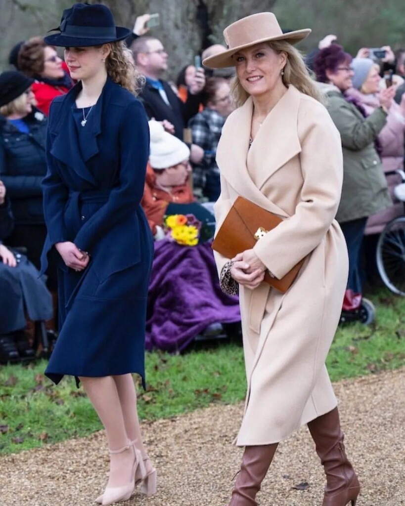 Anche la sempre piacevole e spesso elegante Sophie Wessex non resiste alla tentazione del cappotto in cashmere double con cintura, e pure color crema (Joseph) che la arrotonda molto. In contrasto le linee rigide del cappello da gaucho (JT Millinery) con corona piatta e tesa rigida – in inglese si chiama pork pie perché ricorderebbe l’omonimo pasticcio di carne, pensate voi – e la grande clutch squadrata Sophie von Haubsburg, in un color cuoio che fa a pugni con gli stivali. Si sarà portata un laptop? Shock. Sceglie una linea più smilza la figlia Lady Louise, in blu. Bellissimo il cappotto Roland Mouret, preso a prestito dall’armadio materno; perfetto per una ragazza così giovane il cappello, un trilby JT Millinery. Farò finta di non vedere i sandaletti nude con calze abbinate, chic.