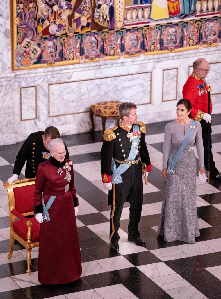 Il 3 gennaio è stata la volta del corpo diplomatico presente a Copenaghen; se Mary ha riciclato anche la sua mise grigia rigorosamente made in Denmark (blusa Birgit Hallstein, gonna Julie Fagerholt) tutta l’attenzione era per la Regina, con indosso il nuovo abito di corte, offerto da Haandv ærkerforeningen, l’Associazione degli Artigiani. Questo vestito sostituisce il precedente, con un modello simile ma realizzato in blu, ricevuto 25 anni fa. Naturalmente Lady Violet non approva collo e polsi in pelliccia, prodotto comunque tipico dei Paesi scandinavi, per il resto la mise, per linea e colore, è splendida. Chic + chic.