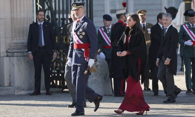 Il tour delle feste finisce il 6 gennaio a Madrid, giorno della Pascua Militar. Riciclo anche per la Reina Letizia, che a sua volta opta per un colore in armonia con quello scelto dalle altre royal ladies.