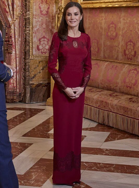 La mantella nera con collo in pelliccia ecologica è Carolina Herrera; l’abito, di Felipe Varela, ha troppo pizzo e troppo inutilmente distribuito; non finisce per sembrare la tenda del salotto di Nonna Speranza solo grazie al fisico asciutto e sottile della Reina. Lo trovo terribile, shock.