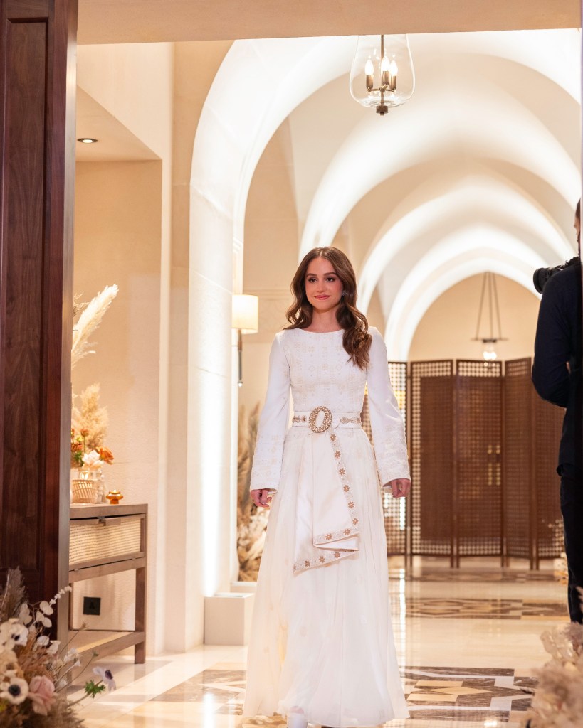 La sposa è arrivata vestita di bianco, in un abito ispirato alla tradizione del suo Paese creato da Reema Dahbour stilista Giordana d’origine palestinese, come Rania. La regina ha aggiunto un tocco pieno di significato dando alla figlia la cintura del suo abito da sposa, disegnato dal britannico Bruce Oldfield (probabile creatore dell’abito dell’incoronazione di Camilla).