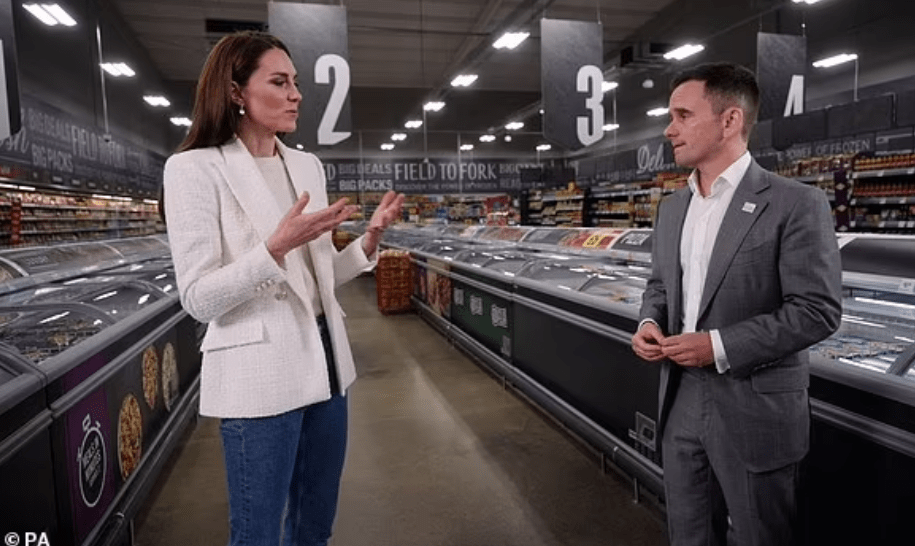 Ieri quasi una replica: la visita ad un supermercato della catena Iceland per incontrare il presidente Richard Walker che con la sua fondazione partecipa al progetto per l’infanzia della principessa. Non ci sono foto a figura intera, ma a noi in fondo può bastare: il blazer questa volta è Zara, in un bel tessuto corposo su una semplice tshirt e un paio di jeans. Tutto già visto ma in questa versione Catherine è praticamente perfetta, come Mary Poppins. Chic. Per vedere meglio la mise, qui trovate un video dell’incontro https://www.youtube.com/watch?v=sJ0Ak9kY1Js