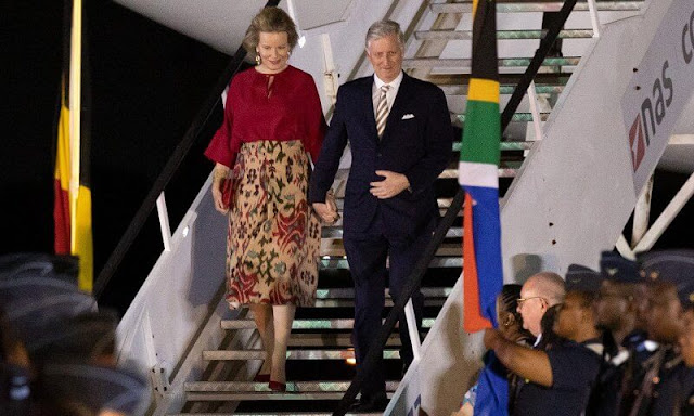 Trasferta africana anche per i sovrani belgi, in visita in Sudafrica, con una selezione delle molte mise cambiate da Mathilde, quasi tutte già viste. Mercoledì 22 l’arrivo a Pretoria; la regina si affida a Natan: gonna dal vago sapore etnico e blusa rosso scuro, come le scarpe – le onnipresenti Gianvito 105 di Gianvito Rossi – e una clutch Armani. Forse la gonna si ispira più al folklore settentrionale, ma per l’occasione mi sembra una scelta adeguata, chic.