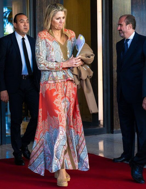 Lunedì la Regina dei Paesi Bassi è volata in Marocco non come sovrana ma nel ruolo che svolge per l’ONU: promuovere la finanza inclusiva e lo sviluppo economico delle aree in difficoltà. All’arrivo Máxima indossa un abito bicolore in cotone e tiene sul braccio un cappotto di cammello, entrambi Max Mara; completano il look uno sciarpone e un paio di sandali con zeppe di corda. Il bizzarro abbigliamento ha una probabile spiegazione nella differenza di temperatura tra partenza e arrivo, nonché nel fatto che la regina non ha viaggiato con un volo di stato ma con una compagnia low cost (la Transavia) portando da sé parte del bagaglio, ma che confusione! Shock.