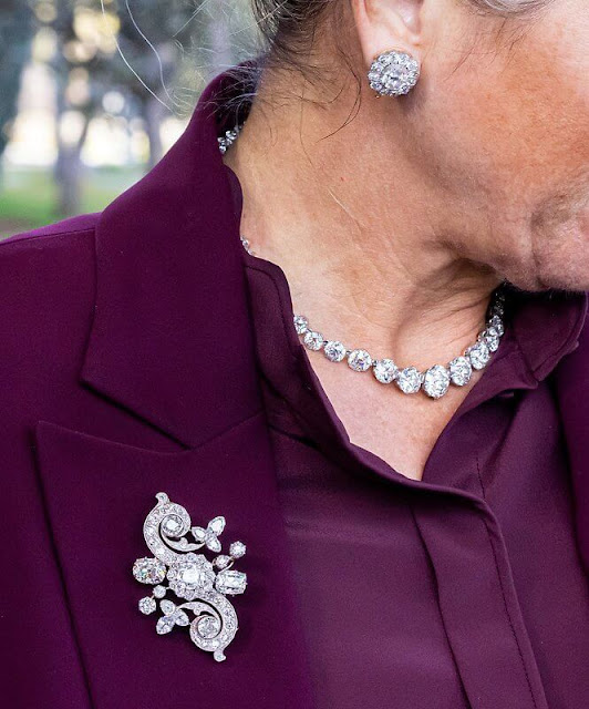 L’ultima mise è qualcosa di totalmente diverso. Il terzo giorno della visita è quello degli appuntamenti formali: la regina ha incontrato il primo ministro Aziz Akhannouch – uno degli uomini più ricchi dell’intero continente africano – membri del Governo, e poi Lalla Meryem, sorella maggiore del re. Per l’occasione Máxima ha scelto un total look color melanzana: completo pantaloni Claes Iversen con camicia abbinata, clutch in tinta – la Moneypenny di Sophie Habsburg – e le immancabili Gianvito 5 di Gianvito Rossi. A lasciare perplessa Lady Violet questa volta è la scelta dei gioielli: una cascata di diamanti. Spilla orecchini e addirittura il collier che fa il paio con la famosa tiara a bandeau. Non sarà troppo? Boh.