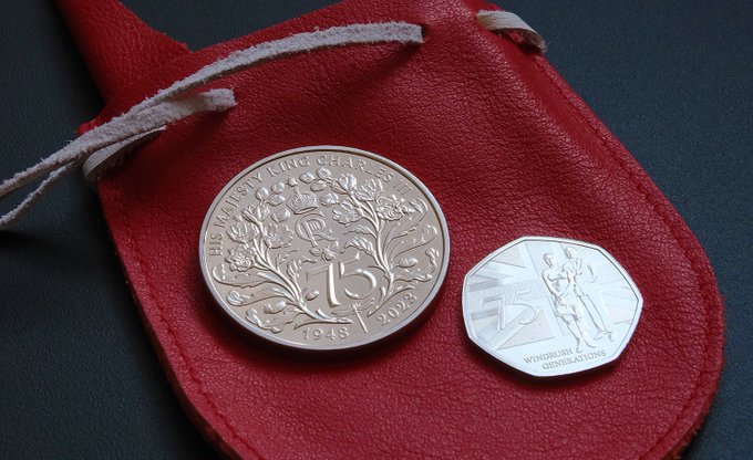 Nel sacchetto bianco ci sono varie monetine di diverso valore, a raggiungere i 74 pence; nel sacchetto rosso invece la moneta da 5 sterline che celebra i 75 anni del Re (li compirà il 14 novembre prossimo) e una moneta da 50 pence: mezza sterlina.