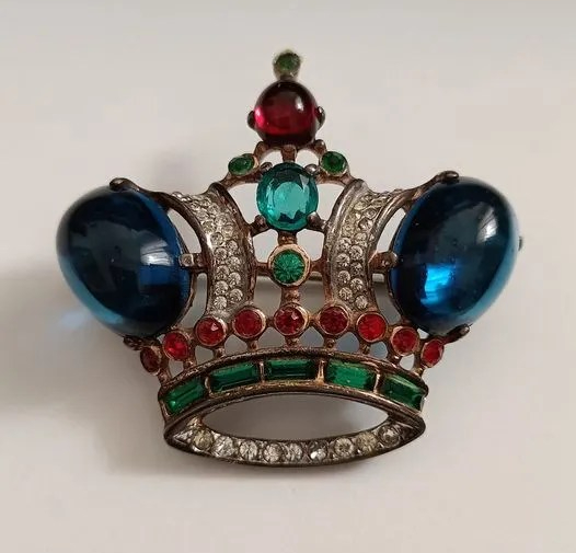 Una piccola, piccolissima riflessione. Mentre nel Regno Unito le ore del Coronation Weekend scorrono – oggi è stato il giorno del grande concerto a Windsor e degli street party in città paesi e comunità varie – mentre qui da noi l’eco tende ad affievolirsi (non temete, ne parleremo ancora a lungo) vi racconto una delle mie sensazioni nell’assistere a quella incredibile cerimonia. Per essere in tema, benché naturalmente fossi a casa, ieri ho indossato questa spilla. Trifari, popolarissimo brand di bijoux americani (ovviamente fondato da un italiano) aveva proposto già negli anni Quaranta una spilla a forma di corona, disegnata da Alfred Philippe, suo designer di punta. Si pensò di riproporla nel 1953 in occasione dell’incoronazione di Queen Elizabeth insieme ad altri soggetti allegorici, come la spada.
