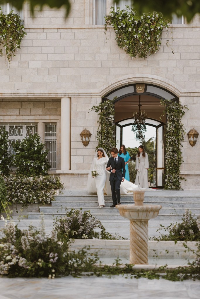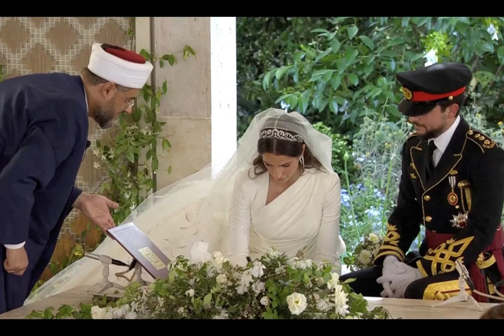 Le due principesse, vestite in modo totalmente differente (la più giovane indossa un abito azzurro di Stella McCartney) svolgono il ruolo di damigelle della sposa, che al suo apparire rivela infine il segreto meglio mantenuto di ogni matrimonio: l’abito nuziale. In questo caso accompagnato da una deliziosa sorpresa: sarà il fratello minore dello sposo, il principe Hashem, diciotto anni di tenerezza e goffaggine, ad accompagnare la quasi cognata e il suo voluminoso strascico all’altare (in senso figurato naturalmente, non ci sono altari nel rito islamico).