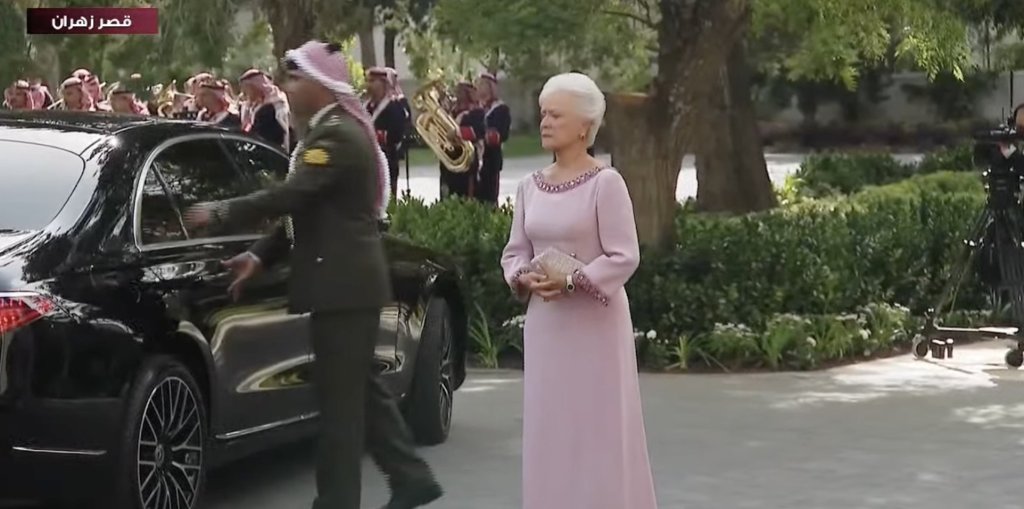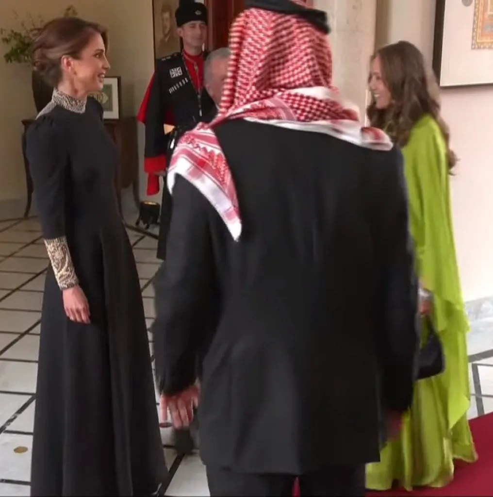 Riconosco solo qualche appartenente alla famiglia reale giordana, molti sono giovani, cugini dello sposo. Non c’è l’ultima moglie del defunto re, la Regina Noor, ma probabilmente ci sono i suoi figli, che non conosco. Col marito Ghazi bin Muhammad, cugino del Re, arriva in elegante caftano verde acido la spagnola Maryam al Ghazi, già principessa di Tărnovo per aver sposato il principe Kardam di Bulgaria, deceduto dopo anni di sofferenza in conseguenza di un incidente automobilistico. La sua rinascita dopo la tragedia l’abbiamo raccontata qui Che fantastica storia. Sicuramente non c’è Haya, sorellastra del sovrano, né il marito Mohammed bin Rashid Al Maktoum, emiro di Dubai, da cui è fuggita e sta divorziando tra problemi e pericoli.