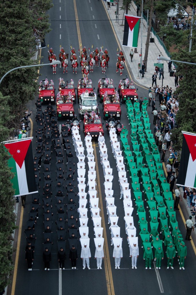 La festa continua – anzi, comincia – bisogna spostarsi a Al Husseiniya Palace; gli sposi lo fanno accompagnati da un corteo che si chiama Red Motorcade: a bordo di una jeep bianca (la stessa usata per le loro nozze dai sovrani) sono scortati da veicoli rossi, 8 jeep e 11 motociclette, nel loro prima bagno di folla da sposati. Io ho molto apprezzato i sidecar, e l’entusiasmo dei giovani volontari della fondazione del principe ereditario che tutti intutati hanno formato una simpatica e imperfetta bandiera