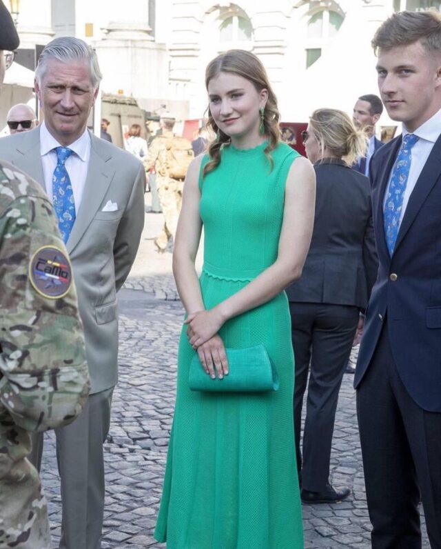 Dopo la parata qualcuno sarà andato a riposare ma non Roi Philippe e la sua famiglia, impegnati a dimostrare il significato dell’espressione “working royals” anche se in Belgio probabilmente non si usa. È il momento della visita alla festa organizzata a Warandepark, che sarebbe il parco reale, dove i reali hanno visitato lo stand della difesa. A sorpresa le signore sono in verde, tra l’altro nella stessa sfumatura: la Duchessa di Brabante ha un maxidress di maglia, bello e piuttosto difficile da portare, del brand The Kooples, molto popolare tra i giovanissimi e dunque finora sconosciuto aLady Violet. Perfetta la clutch nello stesso identico punto di verde, rubata a mamma e firmata Fabienne Delvigne. Chic.