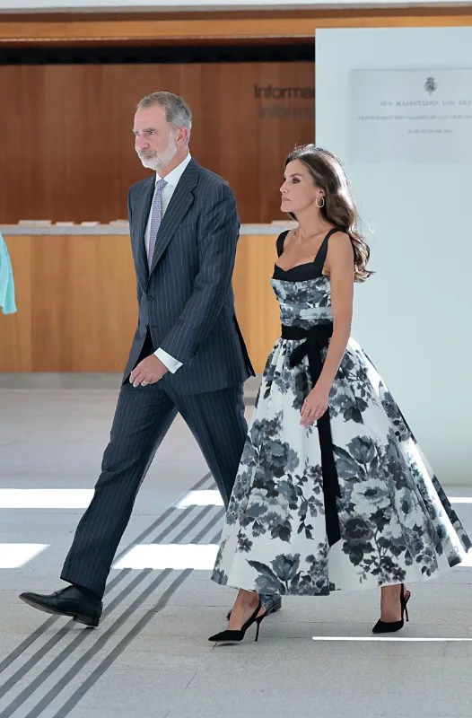 Pensavo e speravo di vederla un po’ di più – in fondo è la sovrana dell’unico regno che è anche meta di vacanze estive – ma la Reina sta dosando le sue uscite, quindi dobbiamo accontentarci di quello che abbiamo. Che non è poco, anzi! Perché martedì 25 Los Reyes hanno inaugurato a Madrid la Galería de las Colecciones Reales, e Letizia ha fatto furore con un abito da cocktail di Carolina Herrera, che firma anche le slingback nere. Corpino sagomato e definito dalla cinta a nastro, scollatura abbondante ma resa meno osé dalla spallina larga, gonna a ruota di lunghezza perfetta, fantasia di grande eleganza. Gli anni ’50 rivisitati in maniera eccelsa. Si è capito che mi è piaciuta? Chic!