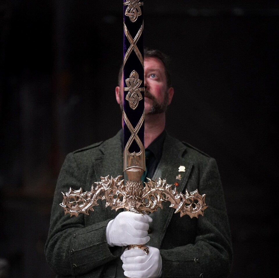 Per l’occasione, è stata forgiata una nuova spada cerimoniale, ricca di simboli della terra delle Highlands; il suo creatore, Mark Dennis, voleva qualcosa che rappresentasse la Scozia senza ricorrere agli elementi soliti dell’iconografia classica. Dunque per il pomello ha scelto un tipo di roccia, lo gneiss, proveniente dall’isola di Iona, nelle Ebridi, mentre per la decorazione dell’elsa ha pensato a tralci di cardo, pianta nazionale cui si ispira l’ordine cavalleresco più importante di Scozia, il secondo del Regno Unito. E proprio il motto dell’Order of the Thistle, Nemo me impune lacessit (nessuno mi provochi impunemente) è inciso su una faccia della lama. Il fodero è in velluto di seta viola con nodi celtici che si rimandano alla storia medioevale; ma la cosa più emozionante è il nome che è stato dato alla spada: Elizabeth.