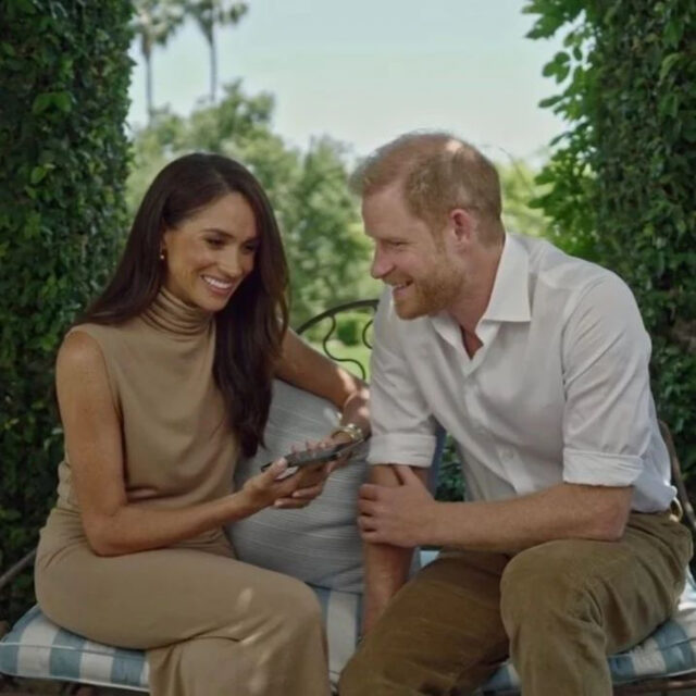 Il giorno prima i Sussex erano apparsi in un video dove telefonavano ai vincitori di The Responsible Technology Youth Power Fund, uno dei progetti che sostengono con la loro associazione Archewell. In questo caso la scelta era caduta su una tonalità di beige/cammello, mirabilmente abbinata ai pantaloni di Harry, e persino ai suoi capelli superstiti. Un colore che dona a pochissime, e lei non è tra queste. Il completo in maglia di Bluesalt, altro brand sostenibile questa volta californiano, si compone di pantaloni e top smanicato con un bel collo alto, che mi ha innescato un’intensa sudorazione. Ma che tempo fa a Montecito? Boh.