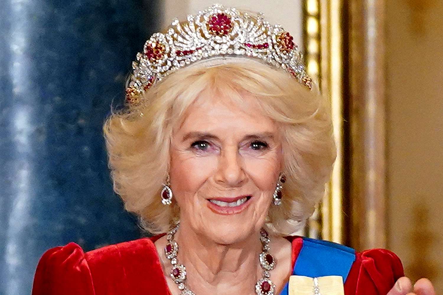 La sera, al banchetto di stato, il protagonista è ancora il rosso, ma stavolta è la Queen Consort ad attrarre tutti gli sguardi. Dai forzieri reali ha preso la Burmese Ruby Tiara, la cui storia abbiamo raccontato qui; Vi piacciono i rubini? La Burmese Ruby Tiara. Queen Elizabeth, che l’aveva commissionata a Garrard negli anni ’70, l’aveva poi indossata nel corso di una precedente visita ufficiale sudcoreana; perché come sappiamo nulla è lasciato al caso, mai. Al sontuoso diadema – che secondo me sta meglio a lei che alla sua prima proprietaria – Camilla ha abbinato collana e orecchini del set Crown Ruby, dono di Prince Albert alla moglie Queen Victoria da abbinare all’Indian Circlet; come quello, la versione originale prevedeva degli opali, poi sostituiti dai rubini da Queen Alexandra, che non li amava (e pensava portassero pure iella). Colpo da maestra, il favoloso abito in velluto rosso rubino di Fiona Clare che le sta d’incanto. Strachic.