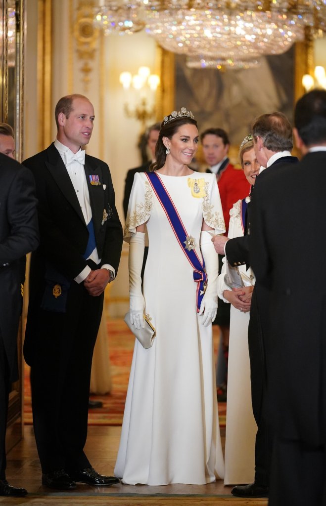 Bianco invece per la Principessa di Galles, un abito di Jenny Packham: il modello Anémone, caratterizzato da una mantellina ricamata a ramages dorati. Si sarà ispirata al nuovo film di Ridley Scott, Napoleon? Che vi devo dire, è tutto l’insieme che non mi convince: la bellissima tiara che non la valorizza e non viene valorizzata, il trucco pesante, l’acconciatura troppo semplice, l’abito, la mantellina, i guanti al gomito (Paula Rowan), pure la borsetta, il modello Maud di Anya Hindmarch; è a un tempo tutto troppo e tutto troppo poco, non so se mi spiego. Di una cosa sono sicura: la placca del Royal Victorian Order, cui la principessa appartiene, piazzata in quel punto quasi a trattenere la fascia è terribile. Per il resto, boh.