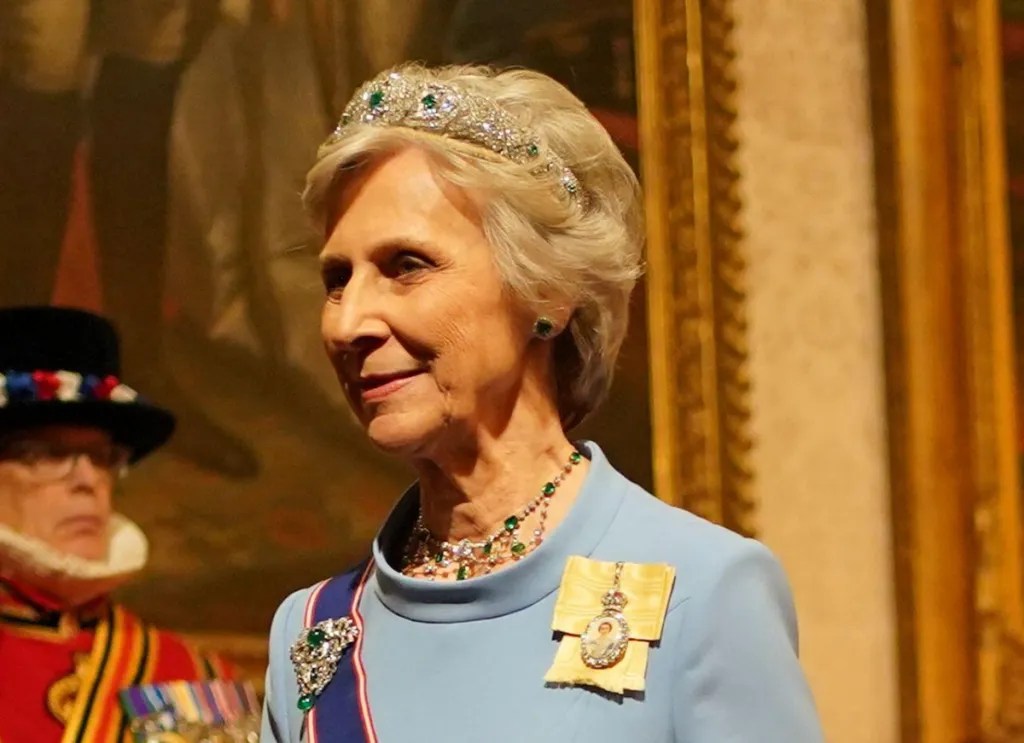 Mi è piaciuta molto, e non accade spesso, la Duchessa di Gloucester. Amo lo stile da giorno quando è adeguatamente declinato per la sera, e qui mi sembra che funzioni. Birgitte, moglie danese di Richard, cugino della defunta Queen, indossa un abito dalla linea semplice ed elegante; interessante lo scollo, anche se magari non esalta il collier di diamanti e smeraldi, parte della collezione della suocera Alice come la tiara bandeau, dono dello sposo per le nozze del 1935.