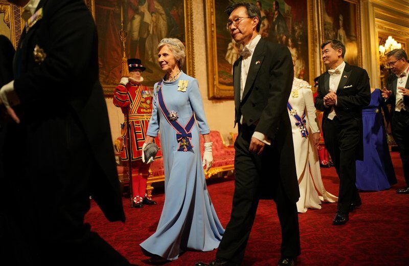 Davanti a quest’orgia di rosso il total blue della Queen Consort è elegante e rassicurante. Camilla riutilizza abitualmente le proprie mise, e infatti abbiamo visto spesso questo cappottino di Anna Valentine, mentre il cappello piumato di Philip Treacy viene dato per nuovo, ma è comunque un modello che ha già portato (ad esempio, al funerale di Her Majesty). La sovrana ha uno stile magari poco eccitante (bene) ma molto riconoscibile (meglio), l’aspetto più interessante di questa fase è senz’altro la scelta dei gioielli; in questo caso ha appuntato sulla spalla sinistra la Russian Sapphire Cluster Brooch, appartenuta alla zarina Marija Fëdorovna, sorella della regina Alexandra – erano entrambe principesse di Danimarca – e acquistata da Queen Mary nel 1934. Per la felicità di King Giorgio (Armani), la regina ha abbinato al blu accessori neri. Chic. Accanto a lei la firts lady coreana Kim Keon-hee con un bel cappotto grigio, inutilmente completato da una sciarpetta dello stesso tessuto. Terribili le calze grigie, idem le scarpine di vernice. Ma cinque bottoni sul polso non saranno troppi? Boh.