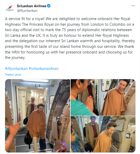 Un’altra sorella su cui si può sempre contare è Anne, The Princess Royal. È sua la prima missione all’estero del 2024 di un membro della Royal Family; la principessa, accompagnata dal marito Tim Laurence, è impegnata in una visita di due giorni nello Sri Lanka, per celebrare i 75 anni di relazioni diplomatiche tra i due Paesi. Oltre all’impeccabile efficienza con cui svolge l’incarico – ogni incarico, in verità – un’altra cosa che si apprezza di lei è la semplicità che non la priva di un grammo di regalità. In questo caso ha volato commercial ha cioè usato un normale volo di linea, portandosi pure il bagaglio a mano. Tra l’altro la compagnia scelta non è la nazionale British Airways, ma la SriLankan Airlines, che si è affrettata a usare la presenza dell’augusta ospite in un messaggio pubblicitario: A service fit for a royal!