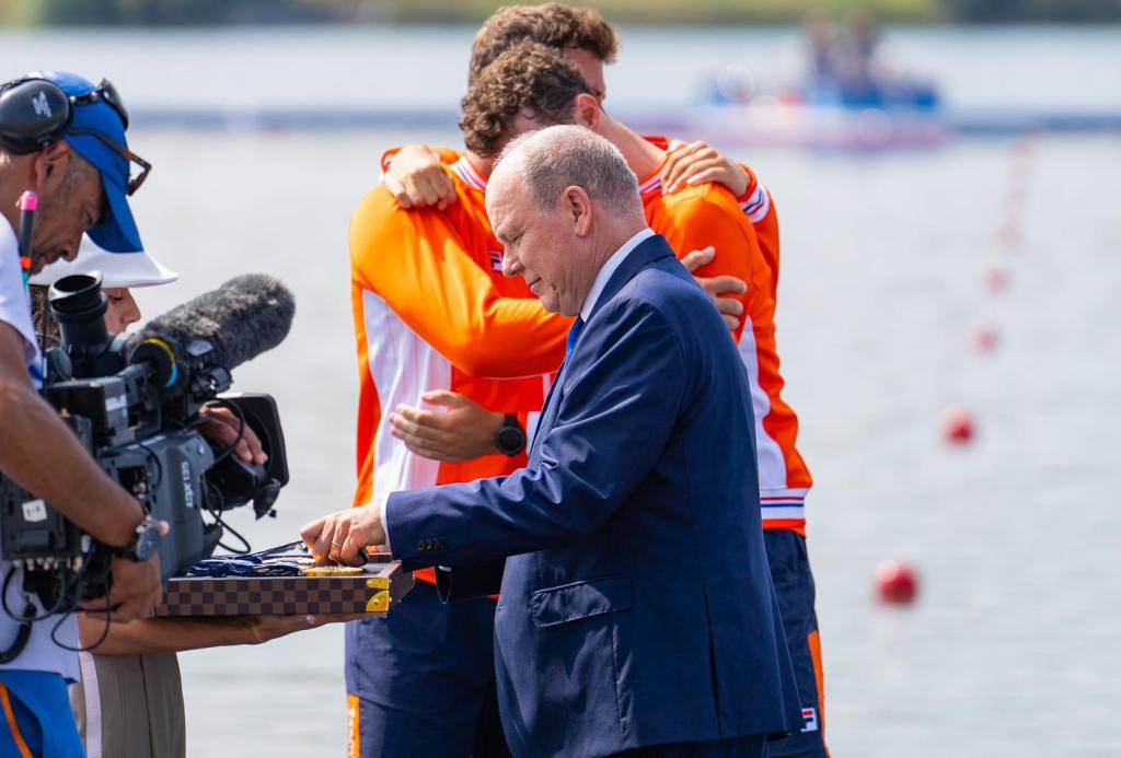 Piccola nota frivola: il signore a sinistra è Jean-Christophe Rolland, già campione olimpico di canottaggio e ora Presidente della Federazione Internazionale della disciplina; porta appuntata sul bavero una spillina col logo Vuitton. Che evidentemente – non lo sapevo e a dire il vero non mi ero proprio posta il problema – funge da sponsor, o meglio da Premium Partner, come si può notare dalla valigetta da cui Albert prende la medaglia, nel tipico tessuto Damier.